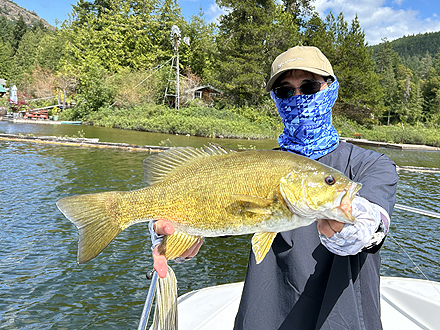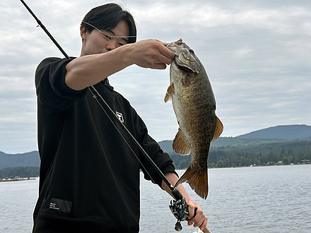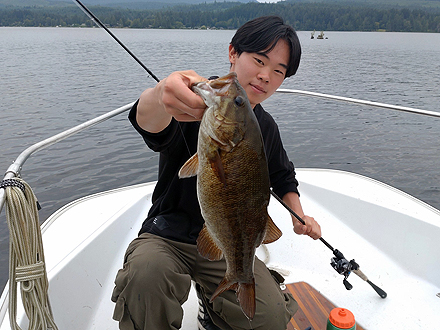初めての海外釣行でした。ショウニガンレイクはとても魚影が濃く、朝、昼関係なくバイトが多かったです。サイズも申し分なく、40upを数本キャッチできました。また、日本ではまだキャッチしたことがないスモールマウスバスの50upも初めてキャッチできました。ガイドさんによると、ショウニガンレイクでトップ10に入るサイズだそうです。 |