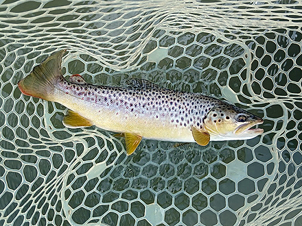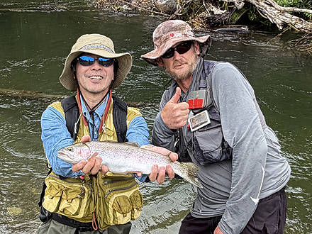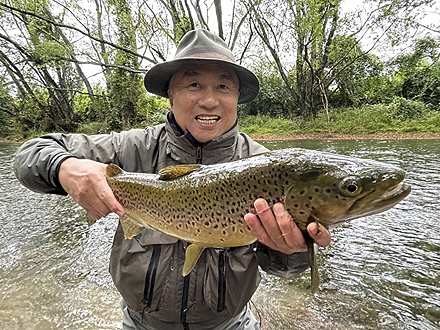 雨が少なく、川は渇水で、水深30cmほどのジンクリアのシャローで、悠々とライズするブラウンに対峙する釣りは本当に面白かったです。達成感ある釣りでした。ガイドさんに感謝します。 |