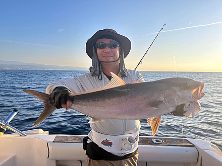 スペインバルセロナの海釣り。船長は潮を読んで操船が抜群に上手い船長でした。トップウォータープラグキャスティングは難しい時期とのことで、ミノーとエサでの釣りで様々な魚種を釣り上げることができました。25キロもあるクイーンフィッシュは船長も見たことないサイズとのことでした。 |