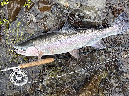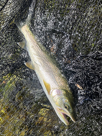 ティペットは16lbs.ぐらいあったほうが、最初のジェットランや取り込み時に余裕があってよい感じでした。12lbs.だとワンミスでブレイクしてしまうので。ラインが太くて見切られるということもあまりないように思いました。あと、ガイドが夜にロッジまで来てくれてフライタイイングのアドバイスをしてくれたのがよかったです。ほとんどそのフライを使いました。 |
