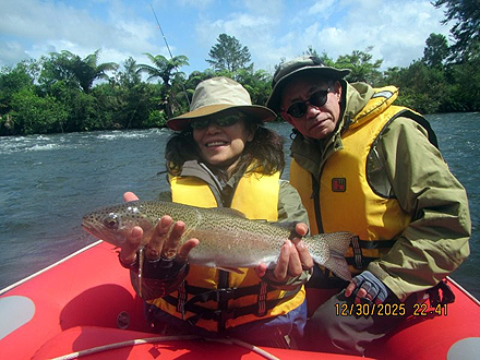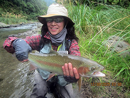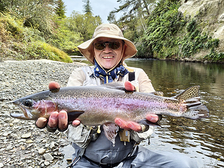 ニュージーランド北島の釣行は初めてです。天候が比較して安定した時期、かつドライフライシーズンも始まっており、マリーさんの熱心なガイドもあって好調な釣果でした。6日間の釣りでしたが、うち3日はランギタイキ川のボートフィッシングを選択しました。マリーさんがライズを見つけボート上からキャストあるいはボートを降りてライズを狙いました。瀬ではボートを降りダブルニンフシステムでインディケーターフィッシングをしました。ランギタイキ川、その支流ストリームでの釣果は50本以上のフッキングでネットインは40本強でした。約半数はドライフライでの釣果です。全て50cm前後、最大58cmで、レインボーが9割でした。全てのレインボウの引きは強烈で、そのやりとりには本当に魅了されます。素晴らしい6日間の経験でした。 |
