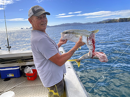 82歳での一人旅でしたが、ベイ・オブ・アイランズのポイントを知り尽くしたベテランキャプテンと、事務を担当する奥さんのお二人が実に親切にガイドしてくれました。そのおかげで、これまで訪れたアラスカ、カナダ、モンタナ、カムチャツカ、メキシコ、パタゴニアのどこよりも満足できる釣行となりました。初日はヒラマサ14尾、鯛16尾を釣り上げ、さらにヒラマサ5尾を掛けましたが、取り込みの途中でサメの餌食になってしまいました。 |